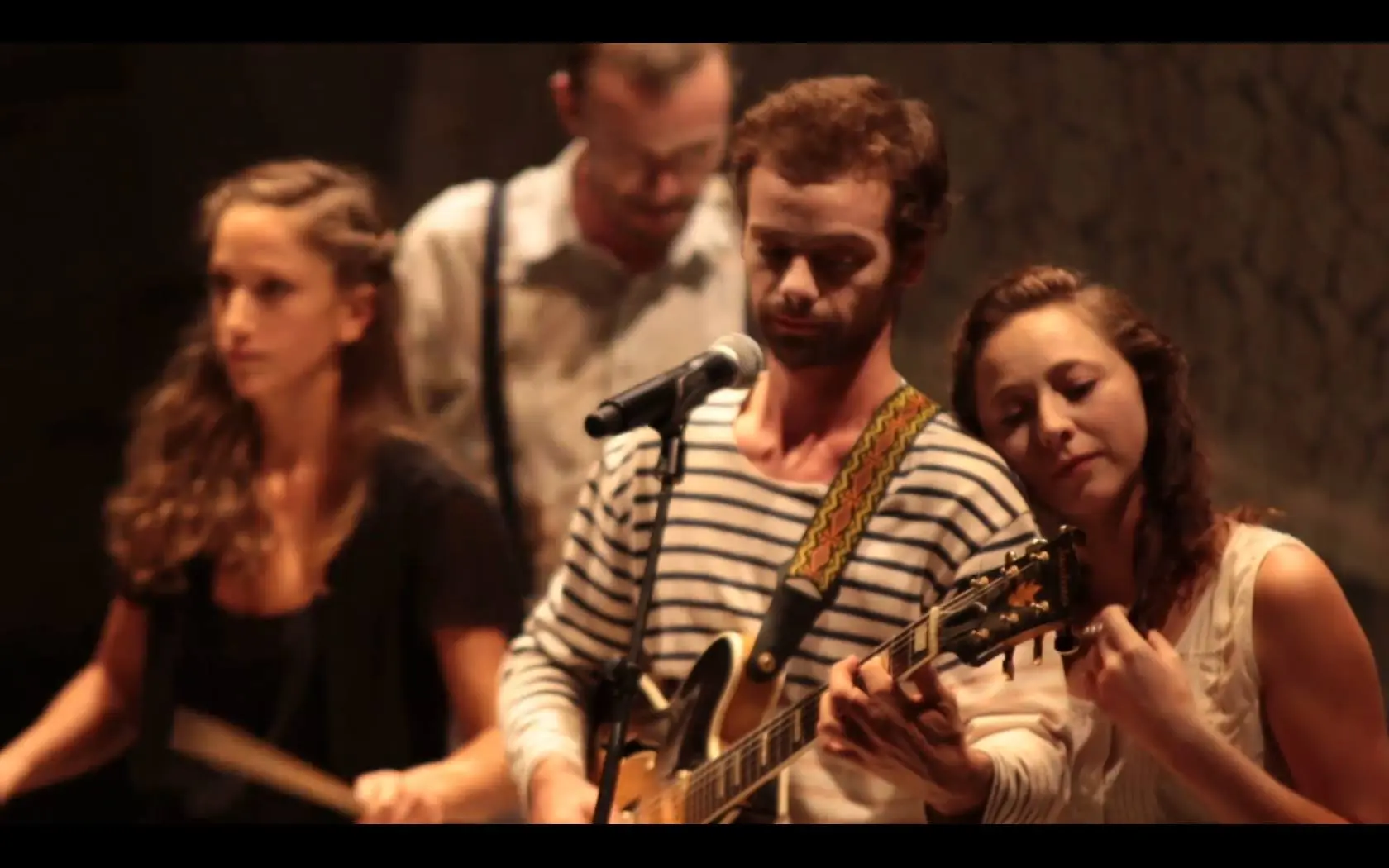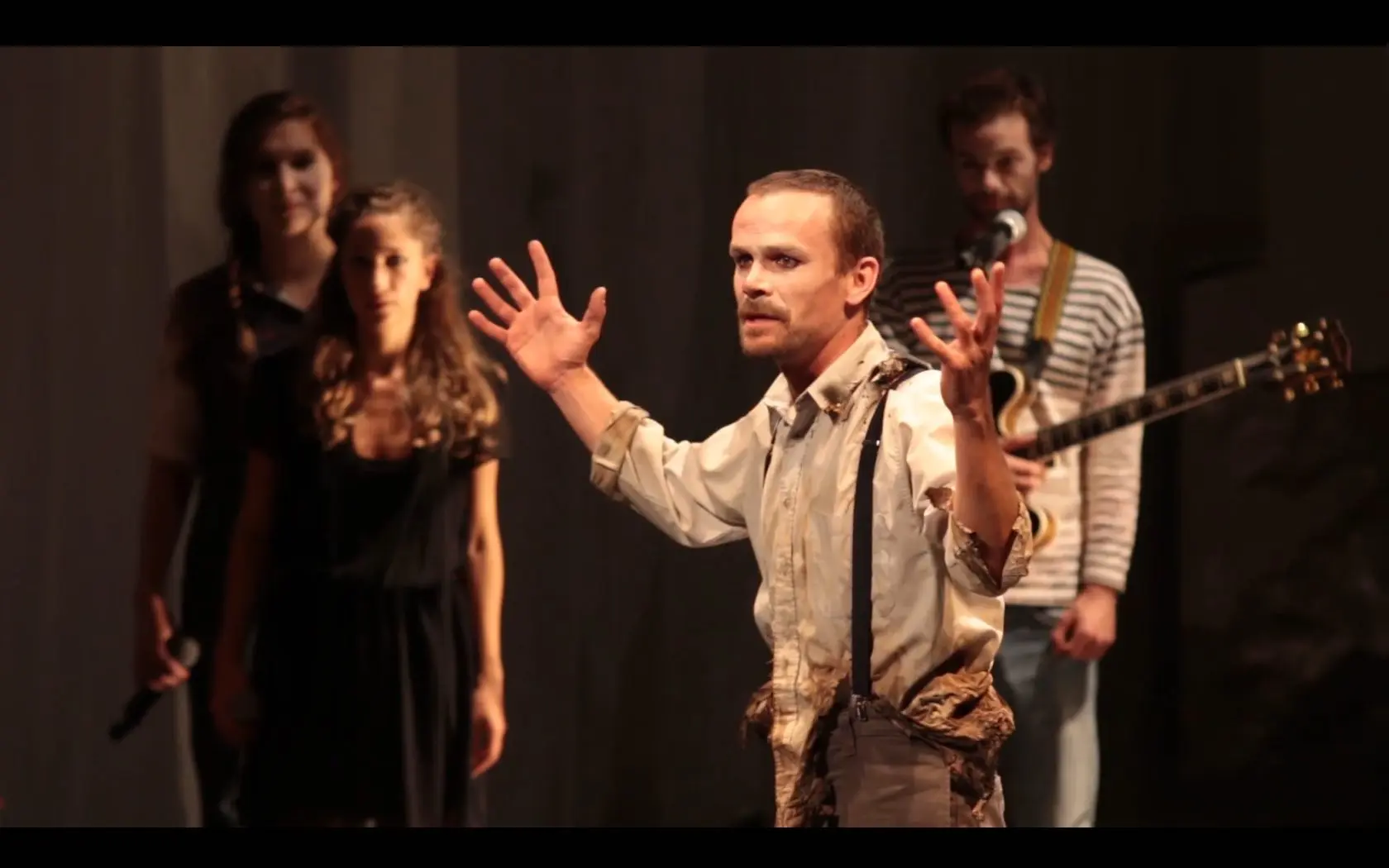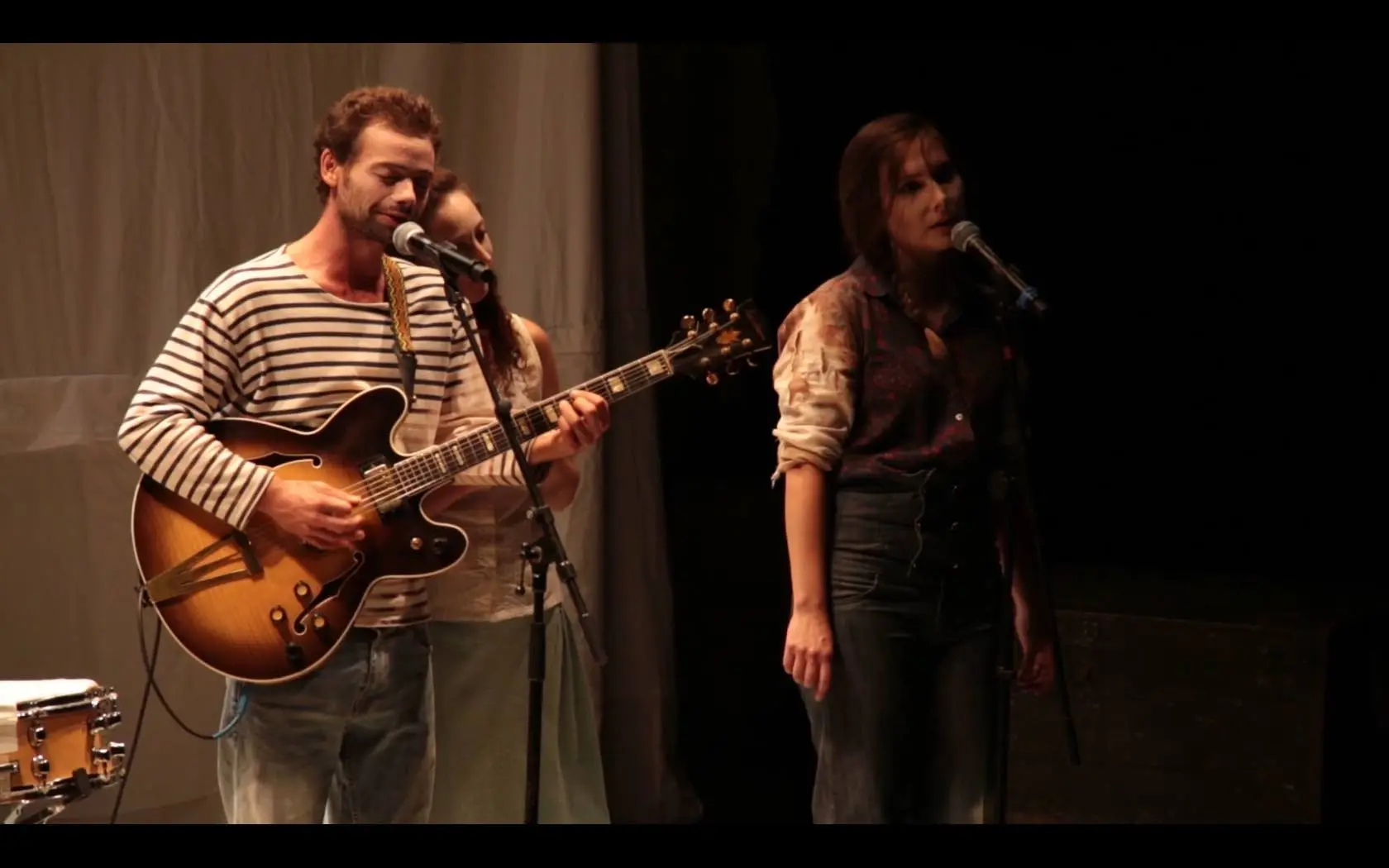 Car ÉCLAIRS, c’est aussi un concert, avec une dizaine de compositions originales interprétées en direct par Aladin Chaboche, guitariste, Jean-Marc Serpin, contrebassiste, et Alice Tabart, au chant, à l’écriture et la mise en scène. Cette dernière a écrit les morceaux en même temps que la pièce, notes et mots se répondant, s’opposant, se complétant afin de créer le deuxième pôle d’énergie nécessaire à cette décharge vitale tant recherchée par les personnages.